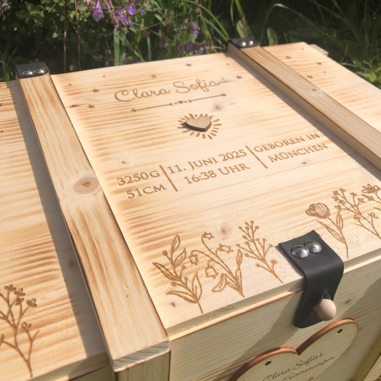 Entdecken Sie unsere personalisierbaren Erinnerungskisten und Erinnerungsboxen für Babys, das ideale Geschenk zur Geburt oder Taufe. Bewahren Sie liebevoll gestaltete Erinnerungsstücke in diesen einzigartigen Kisten auf und halten Sie die besonderen Momente Ihres Babys für die Ewigkeit fest.