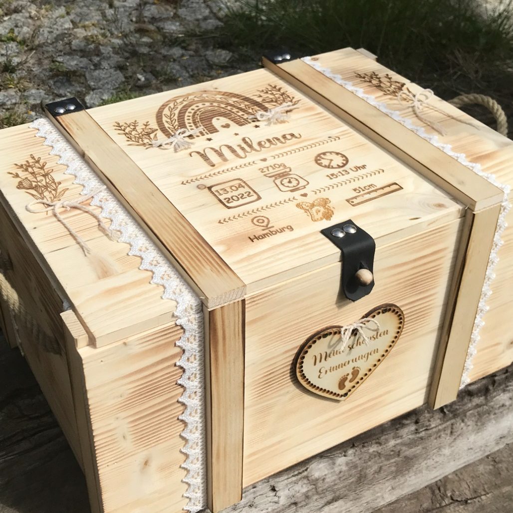 Entdecken Sie unsere personalisierbaren Erinnerungskisten und Erinnerungsboxen für Babys, das ideale Geschenk zur Geburt oder Taufe. Bewahren Sie liebevoll gestaltete Erinnerungsstücke in diesen einzigartigen Kisten auf und halten Sie die besonderen Momente Ihres Babys für die Ewigkeit fest.
